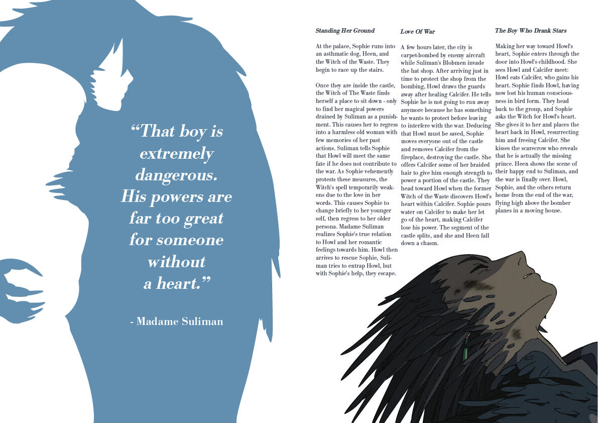 Made six pages worth of magazine spreads summarising a film of my own choice, Howl's Moving Castle.